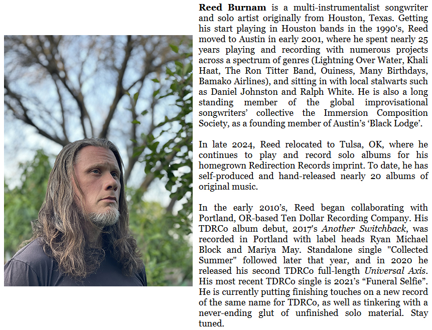 Reed Burnam's most recent solo album Universal Axis (out August 2020 on Portland's Ten Dollar Recording Company) is his 22nd solo record since the year 2000, and his second for TDRCO - the first being 2016's understated and minimalist Another Switchback. Home recorded and hand produced like most of his other material over the last two decades, Universal Axis is decidedly more upbeat, taking a strong cue from irreverent 90's outfits such as Smog, early Ween, Guided By Voices, Mountain Goats, and the Frogs. From the country roadhouse rock of "Truck Stop Coffee" and the DMT shimmer of "Sunlight Gonna Shine in My Window" and "The Ghost of John Fahey", to the cut and paste afro-futurism of "Lined Up" and late night ravers like "Y'all Ready 2 Party" and "I Bought a New Rug Today", Universal Axis just might have something in there that you can dig, if you can dig it, dig? As a rule, Reed's solo output generally barn burns through a patchwork stylistic mobius strip bridging mescaline folk, refracted world music, machine noise, ambient soundscapes, classic video game music, tongue-in-cheek EDM, blackened metal, bubblegum pop, country zen, and whatever else sounds good in the moment, all run through a fiercely do-it-yourself psychedelic blender.