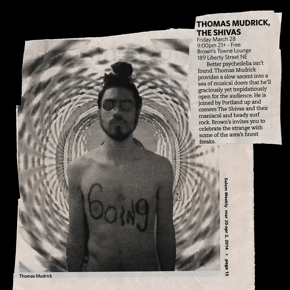 (((boing))) is the latest release from Silverton, Oregon’s Thomas Mudrick, out October 22, 2013 on Portland’s Ten Dollar Recording Company. 2013 has been a busy year indeed for Mudrick, with a full-length release from his side project Nodding Tree Remedies (The 45th Parallel), as well as a second full length solo effort Mongoose Thompson and the Kalapuya Spirit. Not one to be content with staying too long in the same place, all three records are all over the stylistic map, and (((boing))) stands to be perhaps Mudrick’s strongest effort to date.